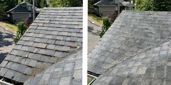 Our roof soft wash treatment does more than clean your roof, it brings it back to life. Using low pressure and professional-grade solutions, we treat every inch of your roof to kill moss, algae, and lichen without causing any damage. You can literally watch the moss begin turning white on contact as it dies, and see the green algae stains wash away right before your eyes. It is a safe and powerful way to extend the life of your roof and make it look like new again.